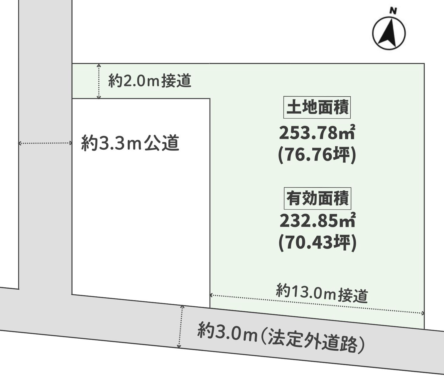 土地面積も有効面積で70坪もあり、車3台以上・庭付平屋住宅も十分可能な広さです。2mの接道では…と、ご心配されるかもしれませんが、南側道路より車の駐車ができ、車の乗り入れ問題無しです!