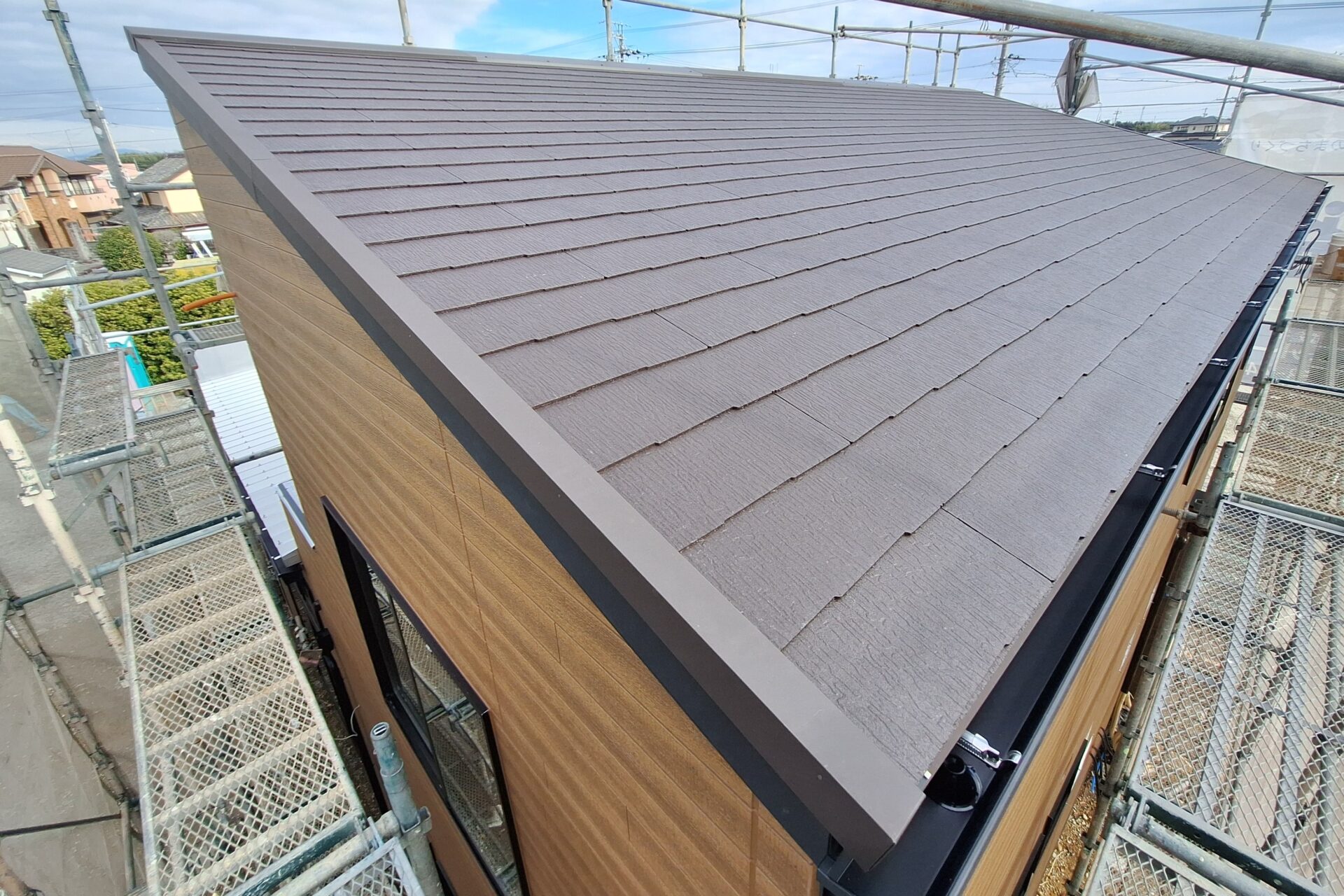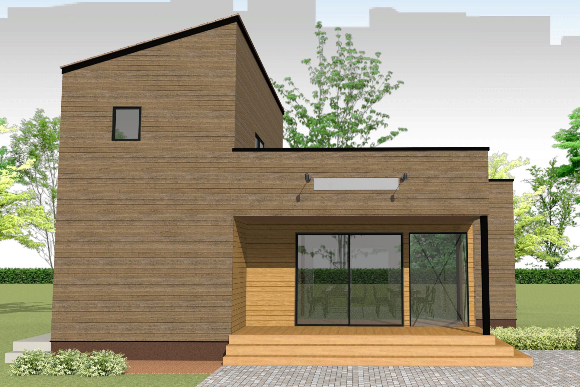 メインがクレールウッドのサロメブラウン、1階セットバック部分が板木目のボワイエロー