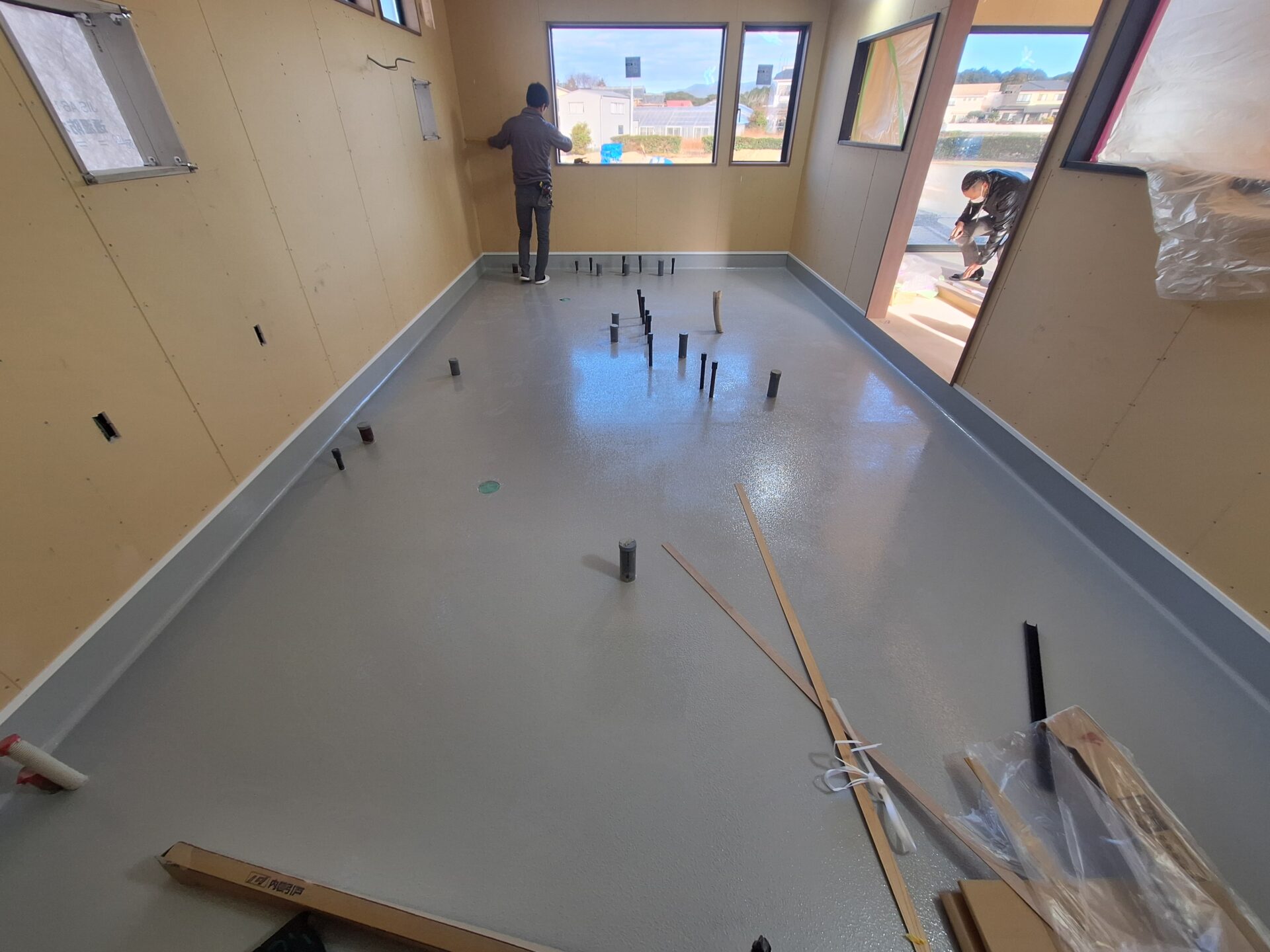 床は耐水性に優れ滑りにくいものとして厚膜タイプの塗装を採用しています