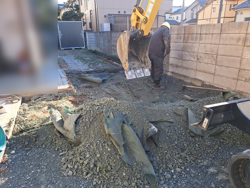 さて工事はというと先ずは現状の青砕石を撤去していき、仕上げ高さを計算して土を削っていきます