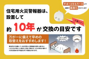 火災か命を守る「火災警報器」の交換、お済みですか? ~「もしも」の時に備える、安心のお手伝いをいたします~ 日々の暮らしの中で、「まさかうちが火事に」と考える方は少ないかもしれません。 しかし、いざという時に大切な命を守 … 続きを読む 『火災警報器』の交換はお済ですか?